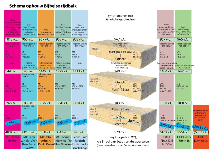 De Bijbelse tijdlijn volgens de Bijbel van Jezus en de apostelen houdt rekening met schepping van hemel en aarde ca. 5300 v.C. en met wereldwijde overstroming ca. 3040 v.C., waarna herbevolking van de aarde heeft plaatsgehad. De afbeelding laat zien hoe uit een vergelijking van Bijbelse tijdlijnen deze als de meest oorspronkelijke naar voren springt. Deze Bijbelse tijdlijn wordt naast de evolutietijdlijn gezet. De evolutietijdlijn gaat uit van een spontaan ontstaan van het heelal 14 miljard jaar geleden, van de aarde 5 miljard jaar geleden en van de mens zo'n 10 miljoen jaar geleden. Een wereldwijde overstroming rond 3 duizend jaar geleden wordt niet erkend. Tussen deze tijdlijnen en de ermee samenhangende levensvisies bestaat een wereld van verschil.